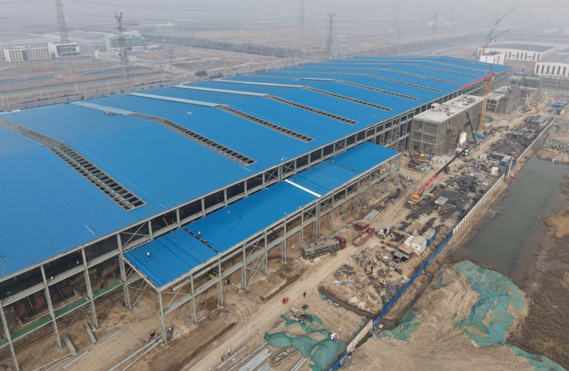該項目是公司近年來承攬的第一個集軋管、熱處理、管加工于一體的熱軋無縫鋼管綜合類項目,也是第一個特殊扣石油套管生產線項目。建成后,將助力達力普石油專用管有限公司建設成為綠色、低碳、智能的鋼管制造基地。自1月 9日起,達力普項目從D-G跨30 線開始向東西兩側封閉廠房屋面瓦,工期歷時43天。屋面分四段封閉,施工過程中采用新型高空壓瓦機,產出彩鋼板共計800噸,廠房最高高度26米,鋪設總面積約74410平方米。