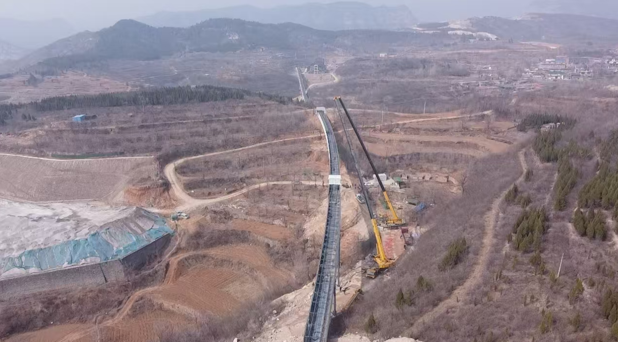 皮帶廊工程是項目的核心部分,是項目建設的“主動脈”,承擔著骨料運輸的重任。該皮帶廊全長1.3公里,從粗破區延伸至605米處開始轉彎,轉彎段全長430.5米,轉彎半徑達1250米,跨越山地,具有跨度大、坡度隨地勢變化顯著、水平弧度大等特點。為確保皮帶廊工程順利施工,項目團隊精心組織,科學部署,結合現場環境,采用“雙機抬吊”作業。
