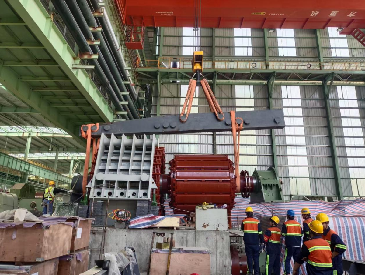 面對這一技術難題,項目部全體員工迎難而上,開啟晝夜奮戰模式。項目團隊通過精確計算臨時支撐墊塊位置、尺寸及吊帶長度,與廠家保持密切溝通,并結合現場實際情況,制定了定子抬高后轉子穿芯整體降低就位的施工方案,為吊裝工作的順利開展奠定了堅實基礎。最終,主電機實現一次安裝就位,圓滿完成此次挑戰。