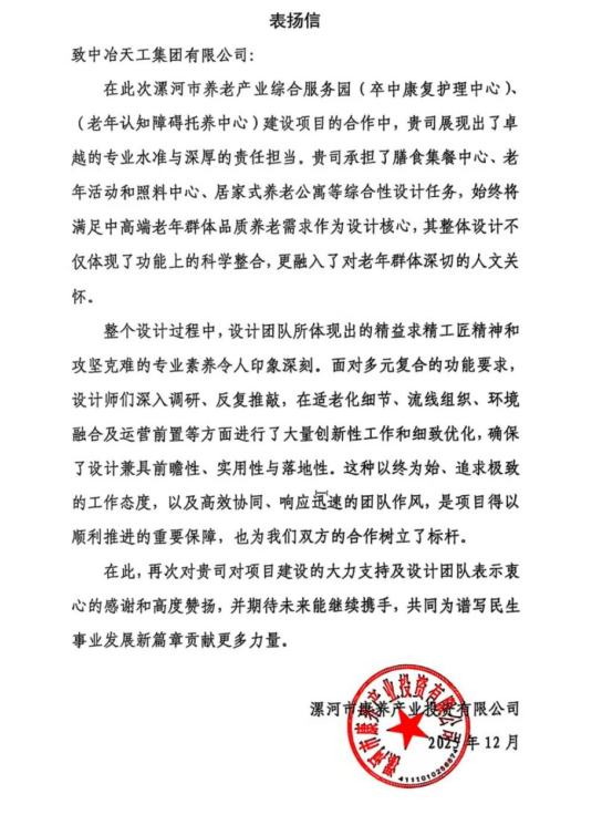 近日,工程技術總院漯河市養老產業綜合服務園設計項目(卒中康復護理中心、老年認知障礙托養中心)收到業主漯河市康養產業投資有限公司向中冶天工發來的表揚信。信中,業主單位對總院設計團隊所體現出的精益求精工匠精神和攻堅克難的專業素養給予高度贊許。