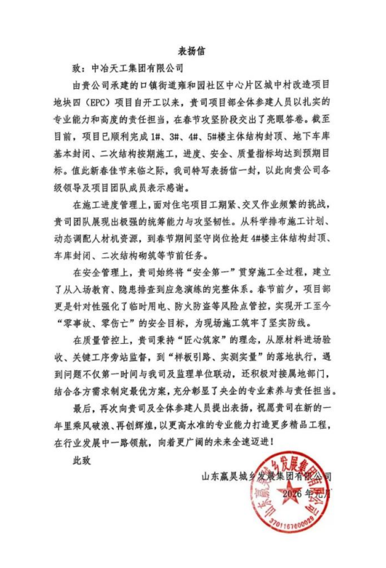 近日,由工業(yè)工程公司承建的山東省濟南市口鎮(zhèn)街道雍和園地塊四項目收到業(yè)主的表揚信,信中對項目在春節(jié)攻堅階段的卓越表現(xiàn)給予了高度肯定與誠摯感謝。