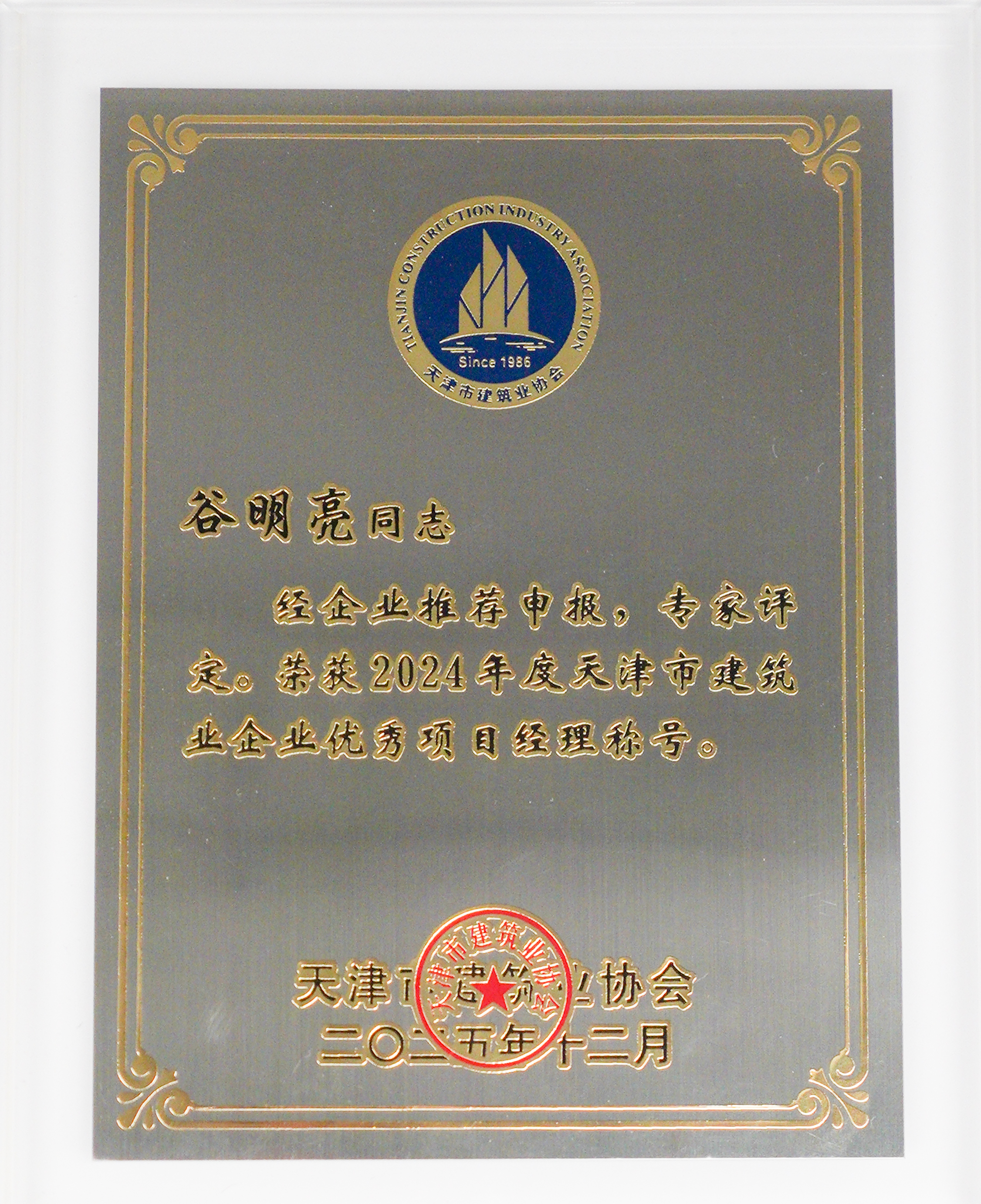 近日,天津市建筑業協會頒發了“2024年度天津市建設工程誠信項目經理”獎牌,公司呂旭東、谷明亮、宋飛翔3名項目經理憑借扎實的項目管理能力、嚴格的履約誠信表現與突出的工程實績,成功獲評“2024年度天津市建設工程誠信項目經理”。